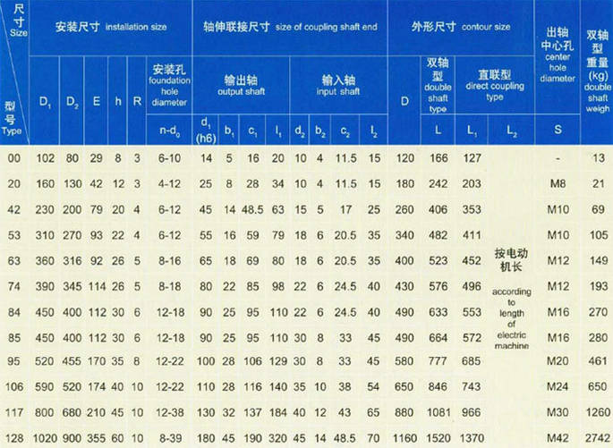 凡單級(jí)可提供的傳動(dòng)比,雙級(jí)均可組合,若需表中未列出的傳動(dòng)比,可與我廠聯(lián)系。