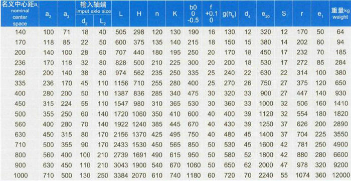 標(biāo)記示例:起重機(jī)減速器三級(jí)傳動(dòng),名義中心距a1=560mm公稱傅動(dòng)比50, 裝配型式第III種,輸出軸為齒輪軸端,臥式安裝則標(biāo)記為:減速器QJS560-50-III-cw.